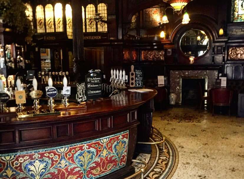 The philharmonic dining rooms liverpool. The philharmonic dining rooms was constructed in 1898 to the designs of walter w thomas for the liverpool brewery robert cain sons. Step in to discover a traditional pub of unique character revered for its eclectic range of real ales and its quality pub food which are served as they should be with a generous measure of famous british hospitality. The philharmonic dining rooms has been upgraded to grade i making it the first purpose built victorian pub in england to be given historic englands highest honour. The interior decoration was carried out by a number of different craftsmen and artists including the renowned sculptor charles john allen 1862 1956 and the architect and designer henry bloomfield bare 1848 1912.